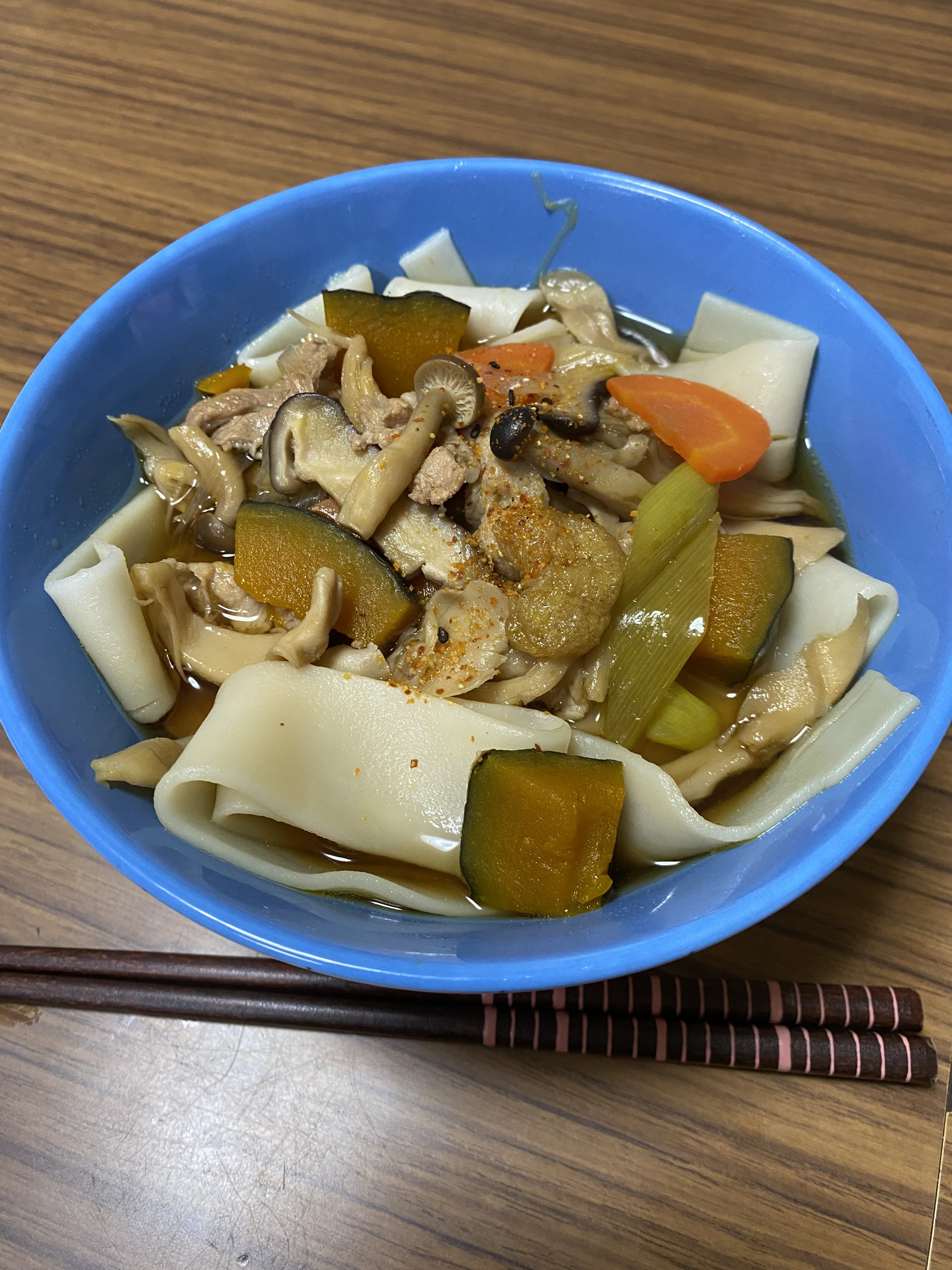 昨日の夜は、きのことカボチャを入れて具材たっぷりほうとう風に煮込んで食べました🍜